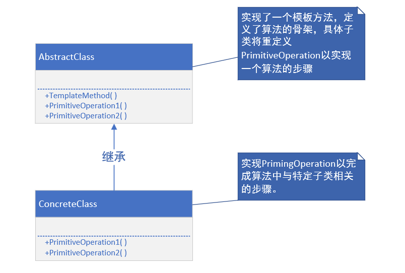 | AbstractClass——抽象模板 包含了一个模板方法,(一般为一个具体方法) 给出了一个顶级逻辑的骨架,而逻辑的组成步骤是各个推迟到子类实现的抽象方法。 顶级逻辑也可以调用一些具体方法。